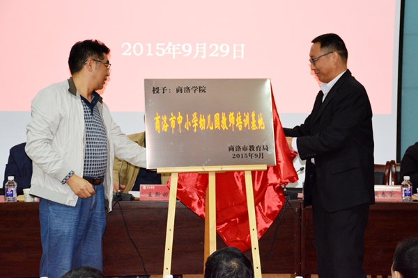 在热烈的掌声中,刘宝盈和周春荣分别代表我校和市教育局为“商洛市中小学幼儿园教师培训基地”揭牌。