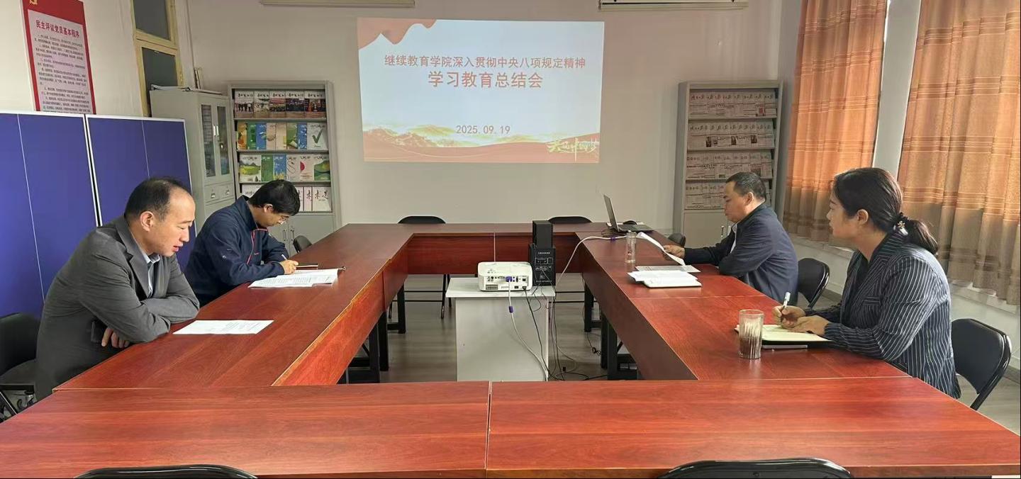 9月19日上午,继续教育学院直属党支部在支部会议室召开深入贯彻中央八项规定精神学习教育总结会。会议由学院直属党支部书记付军昌主持,支部全体党员参加会议。