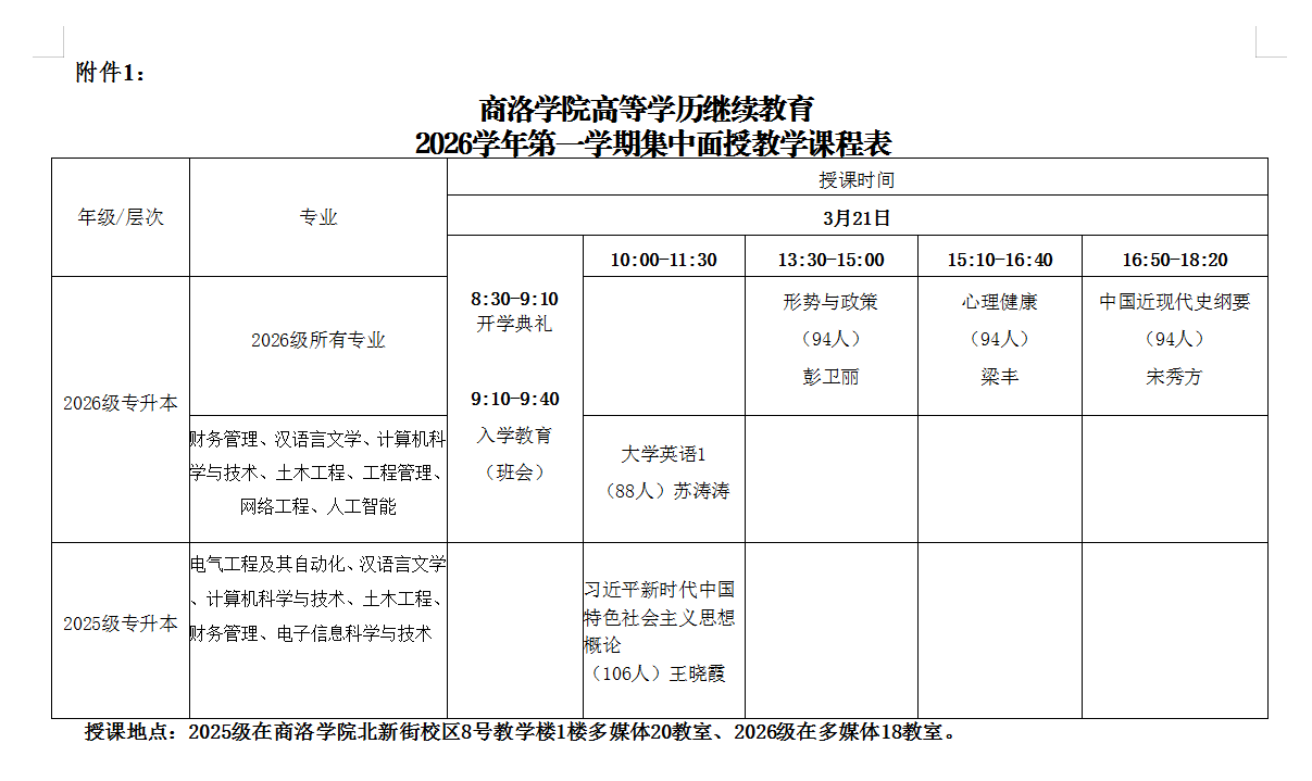 附件:1、商洛学院高等学历继续教育2026学年第一学期集中面授教学课程表。